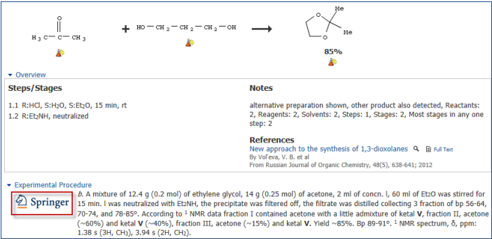 - Springer Experimental Procedure Data: SciFinder incluye procedimientos experimentales de reacciones químicas publicados en 165 revistas de química de la editorial Springer, el periodo cubre artículos desde 1985 hasta la actualidad.