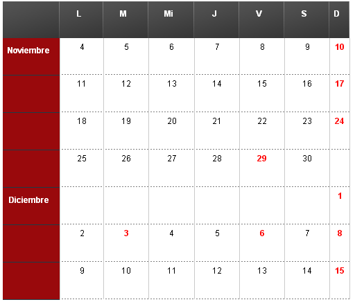 Los siguientes domingos y días festivos señalados en rojo la Biblioteca de Ciencias y la Sala de alumnos de la Biblioteca de Humanidades abrirán con el siguiente horario: