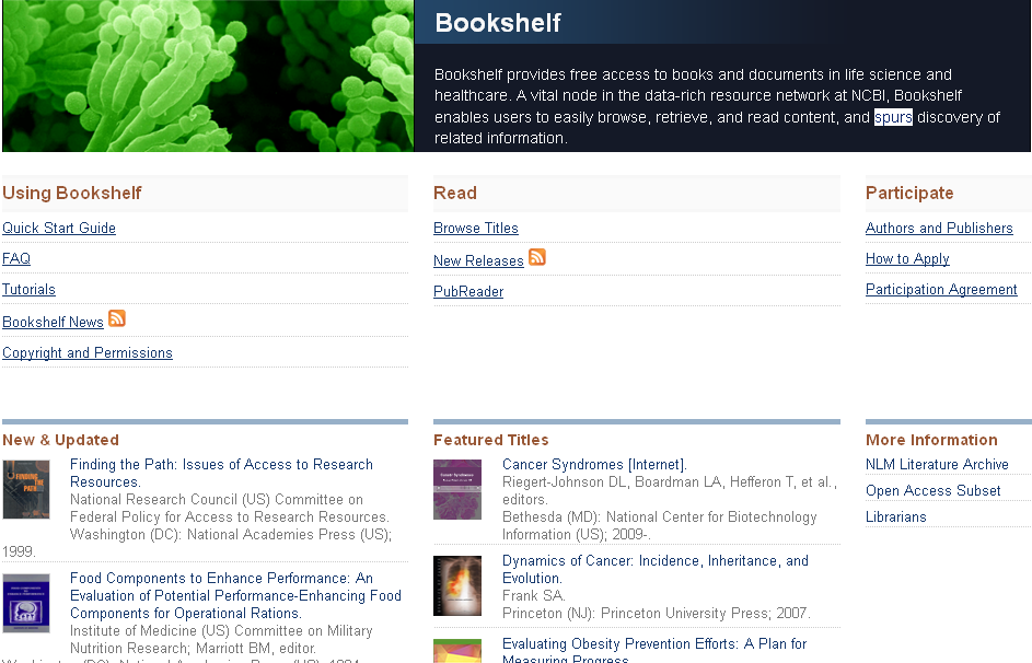 Se ha incorporado a Sabio un nuevo portal de libros electrónicos gratuitos. Se trata de NCBI-Bookshelf, una biblioteca digital con más de 1.600 títulos de ciencias biomédicas.