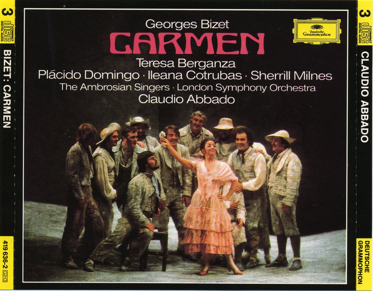 En otra excelente versión, bajo la experta batuta de Claudio Abbado, Teresa Berganza encarna el personaje titular en la tesitura original de mezzosoprano. A pesar de sus evidentes carencias vocales, en las partes más líricas, da muestras de su enorme talento. A su lado, Plácido Domingo, en plenitud de facultades, delinea su apasionado y juvenil Don José, que sin duda, está entre los mejores, como la delicada Micaela de la soprano rumana Ileana Cotrubas. El barítono americano Sherrill Milnes presta su importante voz a un Escamillo no muy matizado.
