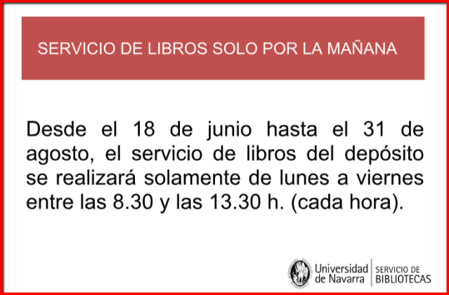 Servicio de libros durante el verano by Biblioteca en Jun 10, 201830 mayo, 2023 Desde el próximo 18 de junio hasta el 31 de agosto, las peticiones del depósito y Sala de Consulta, se servirán sólo por la mañana, de 8.30 a 13.30, cada hora. Comparte esto: Haz clic para compartir en X (Se abre en una ventana nueva) X Haz clic para compartir en Facebook (Se abre en una ventana nueva) Facebook Haz clic para compartir en WhatsApp (Se abre en una ventana nueva) WhatsApp Haz clic para enviar un enlace por correo electrónico a un amigo (Se abre en una ventana nueva) Correo electrónico Me gusta Cargando... Relacionado Navegación de entradas Previous: BibleWorksNext: Nuevas revistas-e de Enfermería