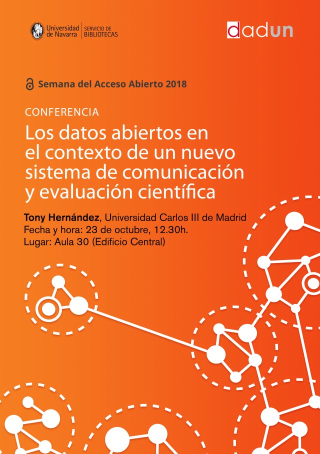 Con motivo de la celebración de la Semana del Acceso Abierto, Tony Hernández, de la Universidad Carlos III de Madrid, impartirá en la Universidad de Navarra una conferencia titulada Los datos abiertos en el contexto de un nuevo sistema de comunicación y evaluación científica.