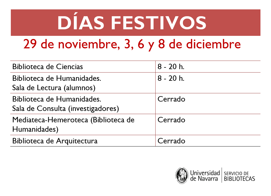 Del 29 de noviembre al 8 de diciembre, compruebe los horarios de apertura de la Biblioteca, concretamente los siguientes días: