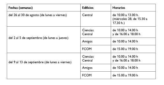 - Salas 0C04, 0E04 y 0E02 (Edificio Ciencias): lunes-viernes, de 13-15 h.