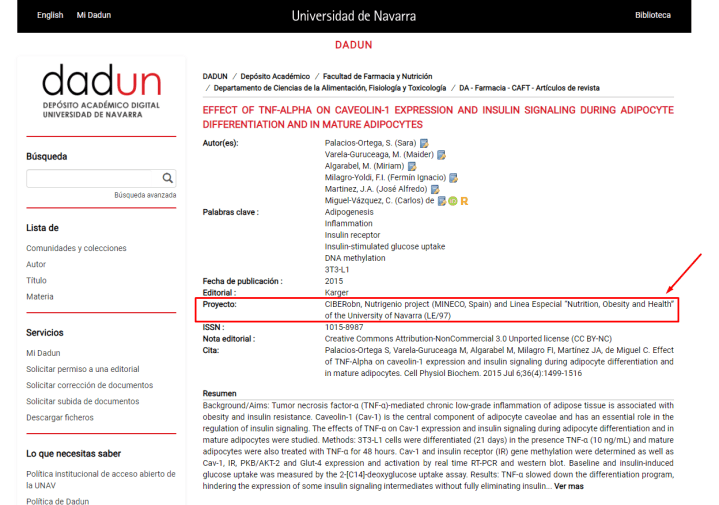 Por este motivo, Dadun cuenta con el campo «Proyecto», que permite identificar y dar visibilidad a los proyectos, becas, etc. que colaboran con la investigación.