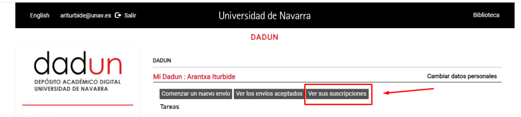 Para mantenerse al día e informado de los nuevos contenidos que se incorporan a Dadun puede crear alertas, no sólo de las colecciones que le interesen, sino también de los autores e investigadores de la Universidad de Navarra.