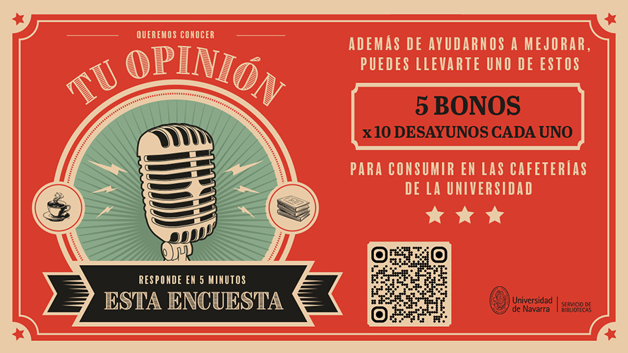 Del 9 al 17 de noviembre estará activa la encuesta de satisfacción del Servicio de Bibliotecas para los alumnos de grado del Campus de Pamplona. Está disponible en el siguiente enlace.