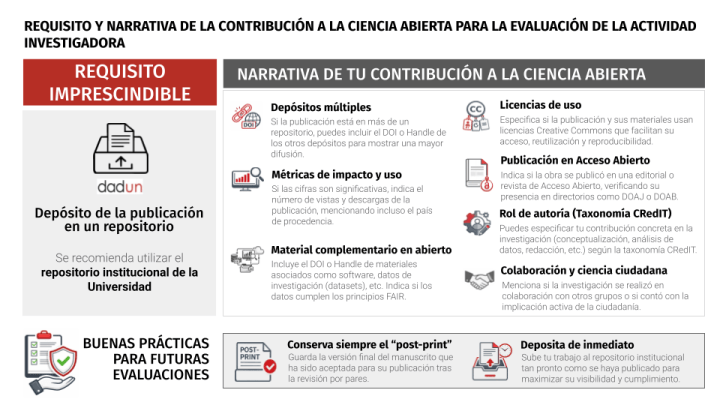 El Servicio de Bibliotecas ha elaborado una infografía que recoge una serie de recomendaciones a la hora de redactar el apartado de contribución a la Ciencia Abierta, uno de los criterios incluido en la convocatoria de sexenios 2025.